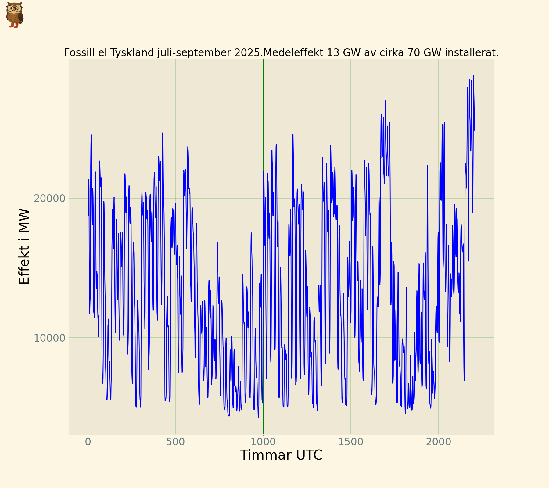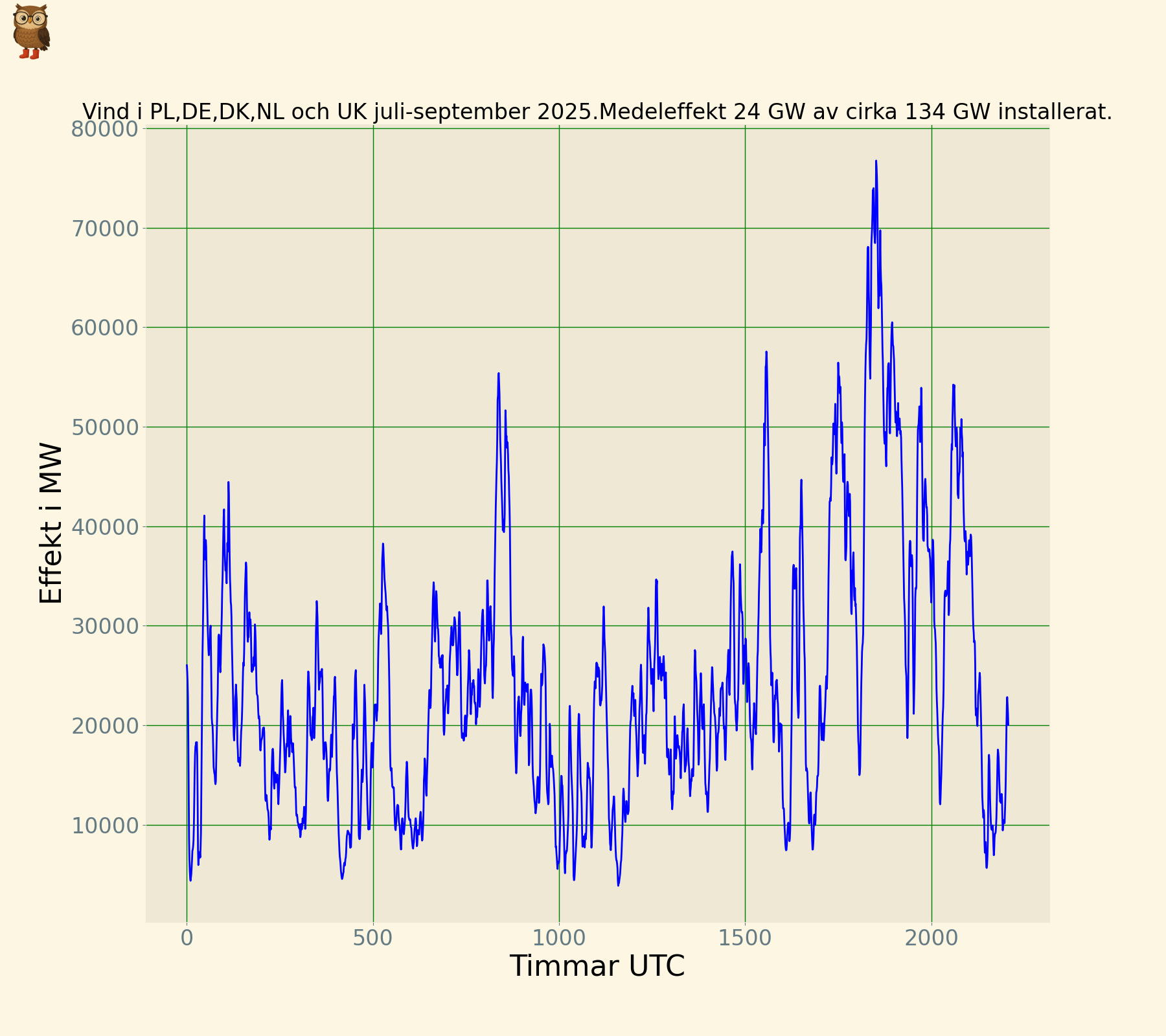 Danmark får vara med igen, juli-september ser ut som nedan. Att levererad effekt ökar med höstens ankomst är normalt och förväntat, värre är att svängningarna får en högre amplitud, vilken tur att tyskarna har mycket kolkraft.