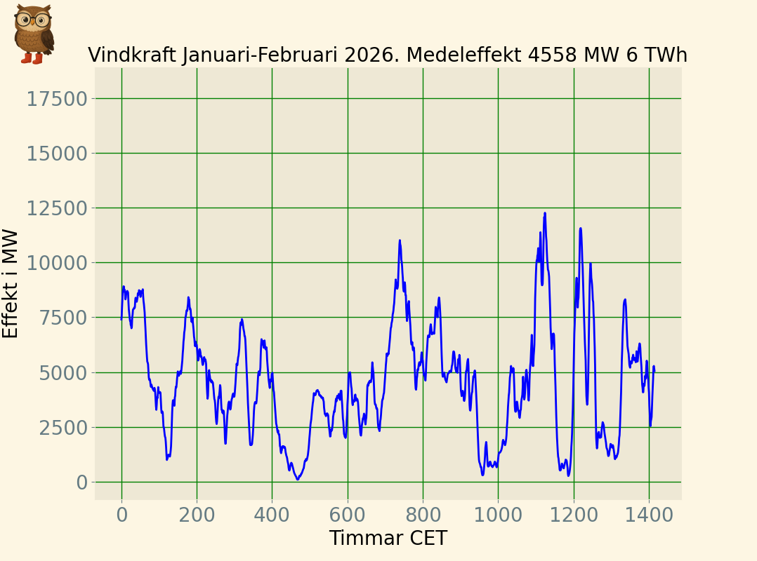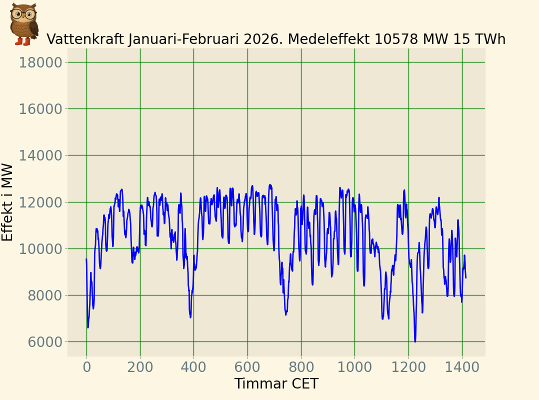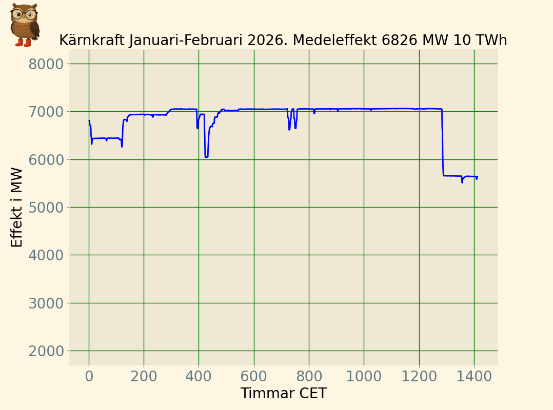 Nästa graf är kärnkraften, den har väl gått så där. Året börjar med en försening av en uppgradering. till högre effekt, av Forsmark 1, men den är ändå klar när helgerna är överstökade. Sen kommer en dipp för Forsmark 3 men det är planerat arbete en helg och fungerar bra. Sen är det en del mindre dippar resten av perioden, normalt ventiltester som utförs under helger. Perioden avslutas med att Oskarshamn 3, vår största elproducerande enhet, tas ner för byte av packningar på ett stort antal ventiler. Det är planerat att pågå till 28/3 och följs sen av en knappt två månader lång årlig revision. Man kan ju ha åsikter om det här, men notera att en årlig revision går inte att flytta på, det är alldeles för mycket planering som inte går att rucka på där, och den är lagd under en period där vi lätt ska klara ett så stort bortfall, varmare väder och en vårflod i antågande. Om stoppet 23/2 kan man väl säga att vi hade i alla fall tur med vädret, vintern släppte sitt grepp om Sverige just den veckan. Men vi behöver mer inte mindre planerbar elproduktion.